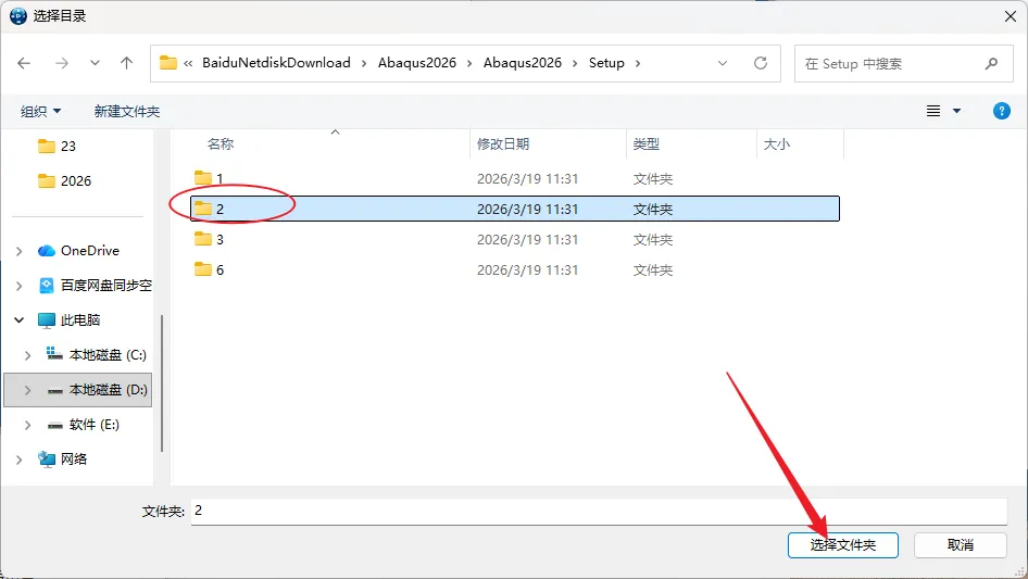 38.打开安装包解压后的【Abaqus2026】文件夹中的【Setup】文件夹,选中【2】文件夹,点击【选择文件夹】。