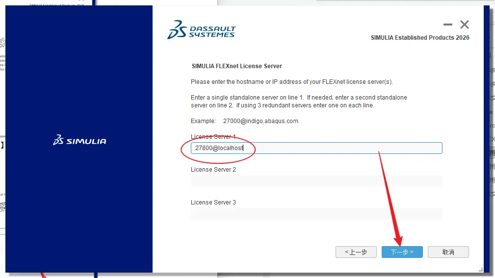 43.在License Server1处输入【27800@localhost】,点击【下一步】。