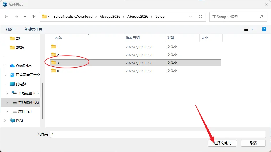 52.打开安装包解压后的【Abaqus2026】文件夹中的【Setup】文件夹,选中【3】文件夹,点击【选择文件夹】。