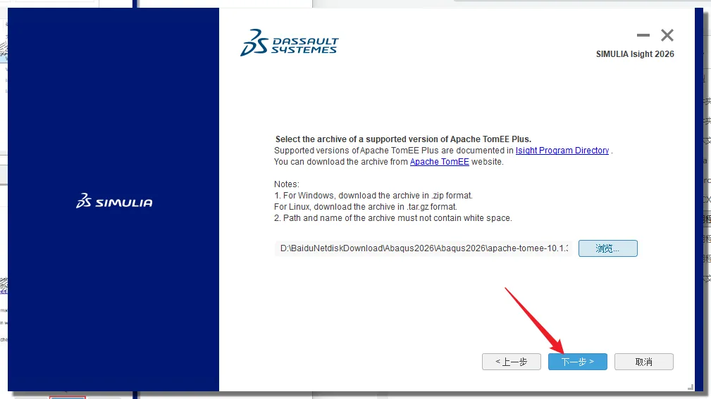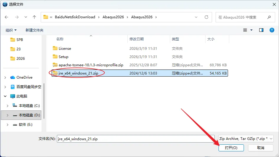 65.打开安装包解压后的【Abaqus2026】文件夹,选中【apache-tomee-10.1.3-microprofile】压缩包,点击【打开】。