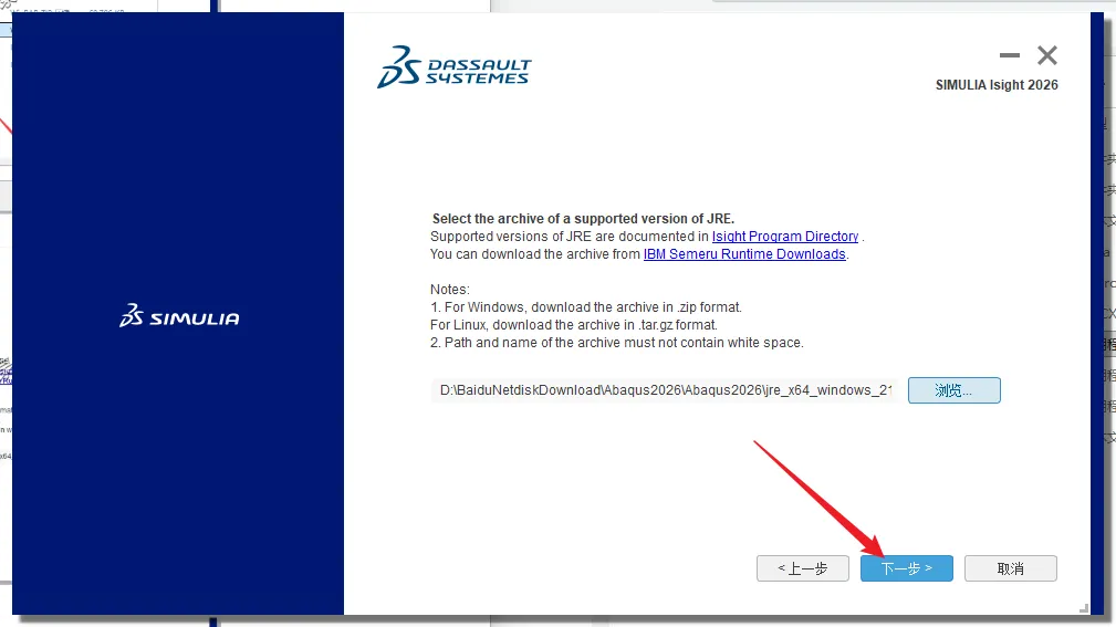 61.打开安装包解压后的【Abaqus2026】文件夹,选中【jre_x64_windows_21】压缩包,点击【打开】。