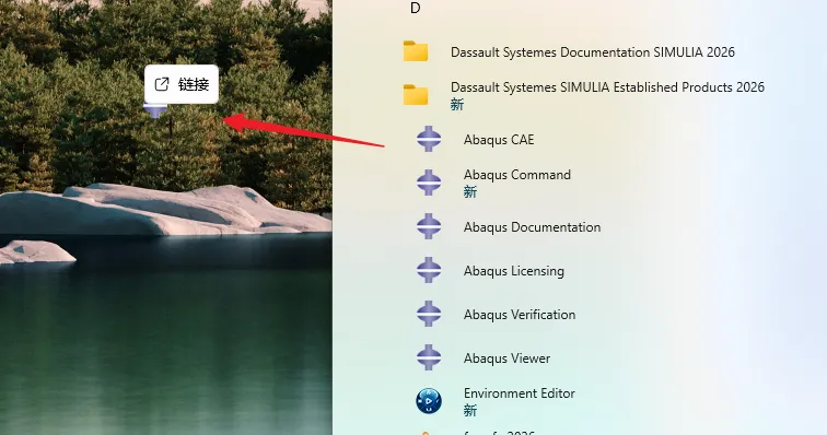 71.创建桌面快捷方式:①点击桌面任务栏中的【开始图标】>点击【所有应用】②双击展开【Dassault Systemes SIMULIA Established Products 2026】文件夹③将【Abaqus CAE】图标拖到电脑桌面。