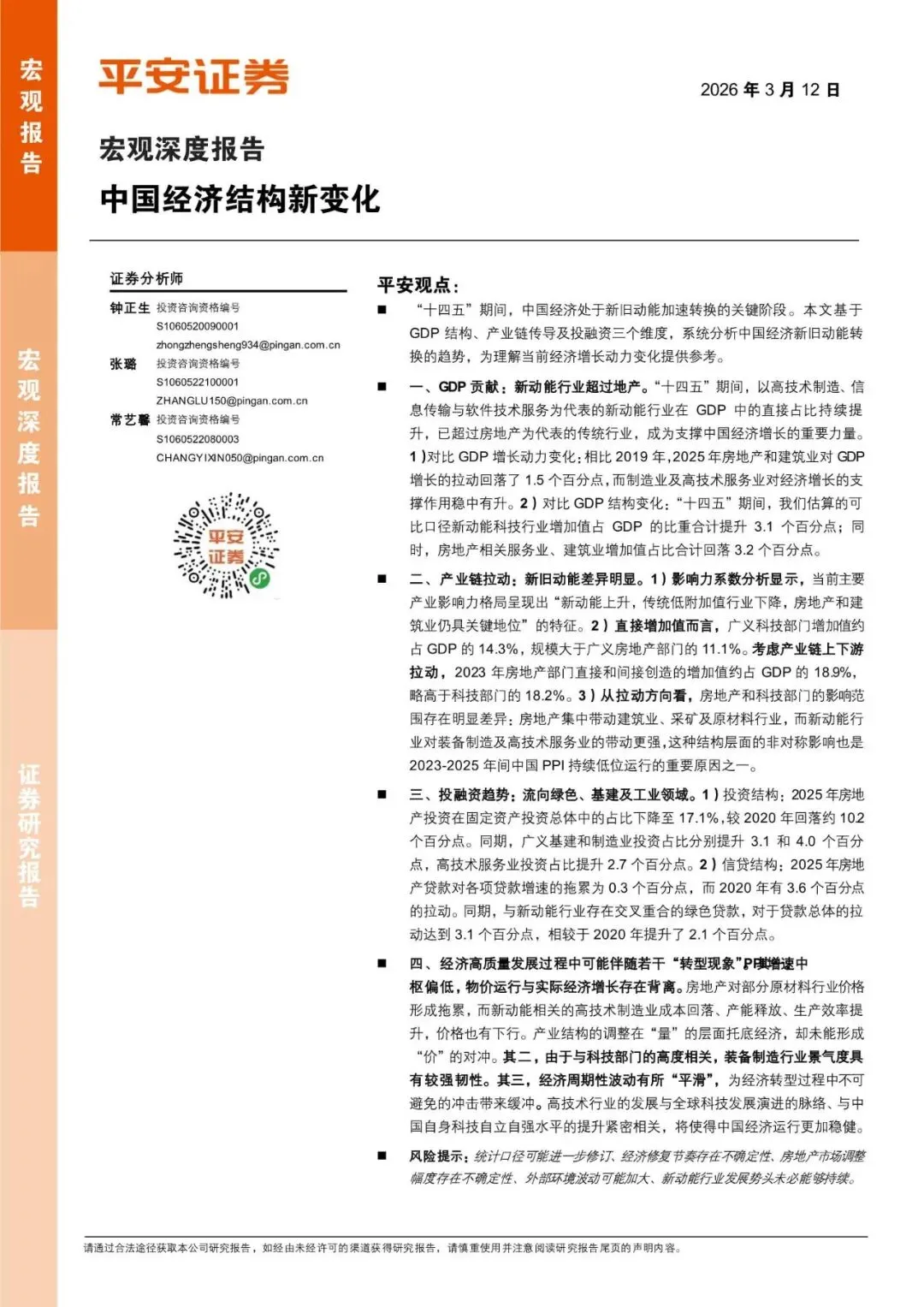 宏观深度报告:中国经济结构新变化(附下载)文章摘要“十四五”期间,中国经济处于新旧动能加速转换的关键阶段。本文基于GDP 结构、产业链传导及投融资三个维度,系统分析中国经济新旧动能转换的趋势,为理解当前经济增长动力变化提供参考。文章内容由于文章篇幅限制,只能分享部分暗号:宏观深度报告:中国经济结构新变化-260312-平安证券-21页免责声明:以上报告均系本报告通过公开、合法渠道获得,报告版权归原撰写/发布机构所有,如有侵权,请联系作者删除,本报告为推荐阅读,仅供参考学习,不构成投资建议,如对报告内容存疑,请与撰写/发布机构联系。往期推荐2022年智能家居系列研究报告(附下载)2023-02-082022年中国云计算创新活力研究报告(附下载)2023-02-072023跨年科学演讲研究报告(附下载)2023-02-052022年度消费新潜力白皮书(附下载)2023-02-022022年医疗器械年度创新白皮书(附下载)2023-02-012023年中国软件技术发展洞察和趋势预测研究报告(附下载)2023-01-312022年中国式家族办公室行业发展白皮书(附下载)2023-01-302022年区块链赋能农业发展研究报告(附下载)2023-01-292022年中国宽带发展白皮书(附下载)2023-01-272023年美妆和家清产品消费者洞察研究报告(附下载)2023-01-25点个在看你最好看