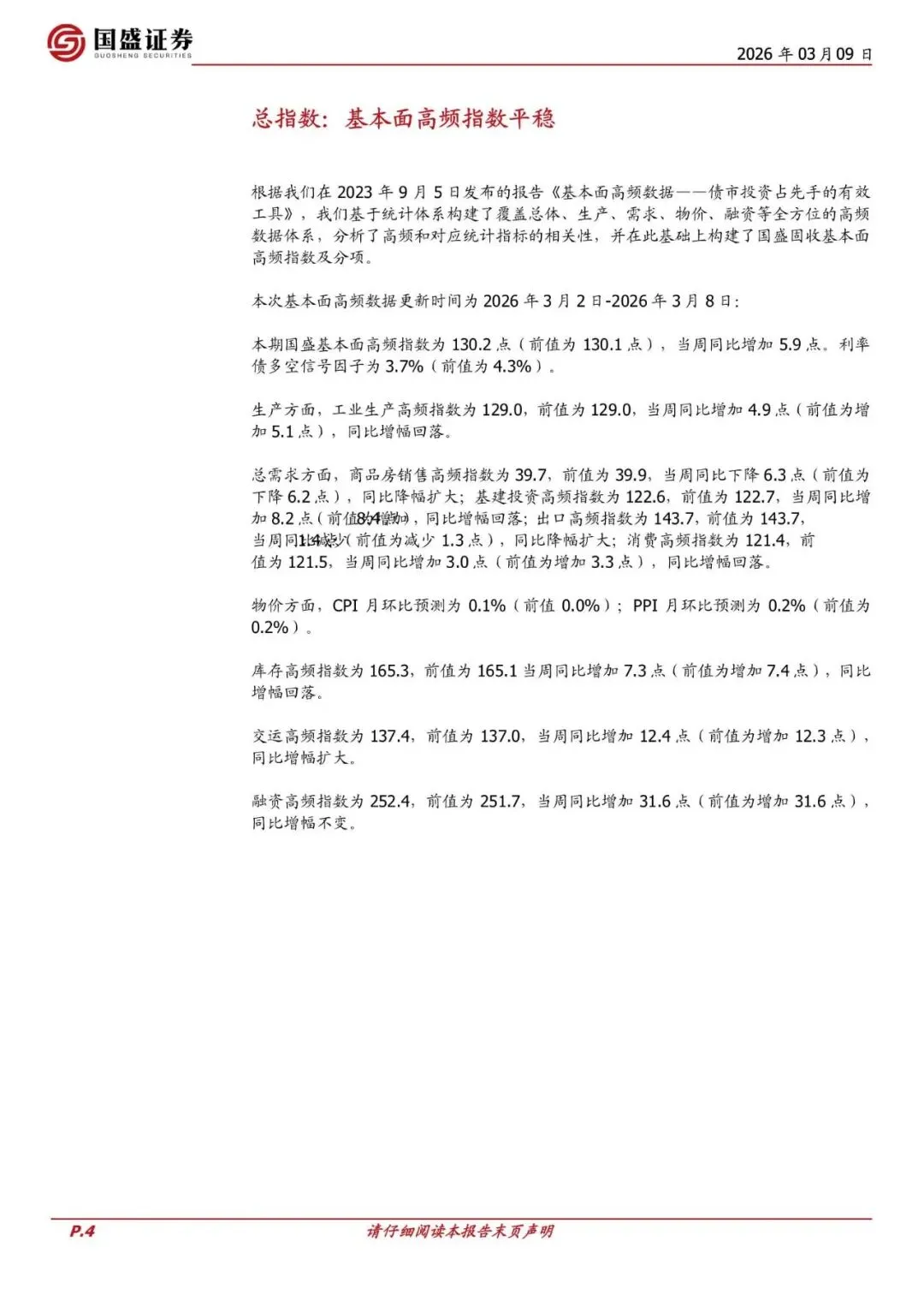 本期国盛基本面高频指数为 130.2 点(前值为 130.1 点),当周同比增加 5.9 点。利率债多空信号因子为 3.7%(前值为 4.3%)。