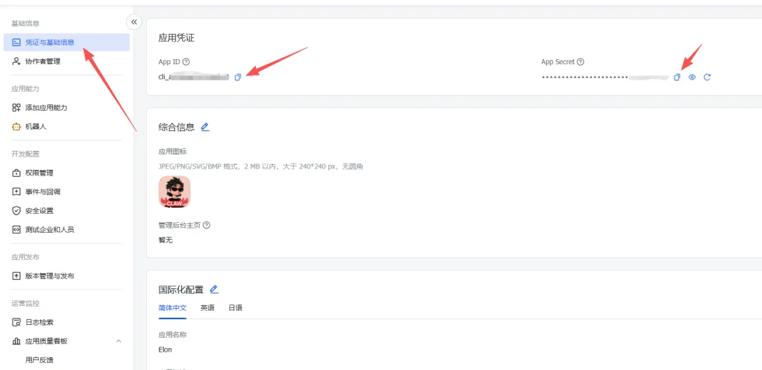 在应用的凭证与基础信息页面,复制:App ID和App Secret