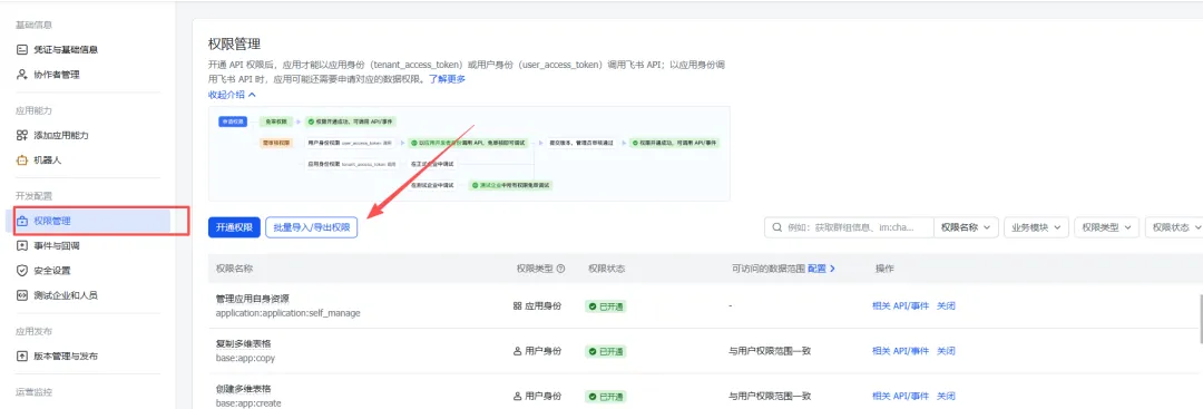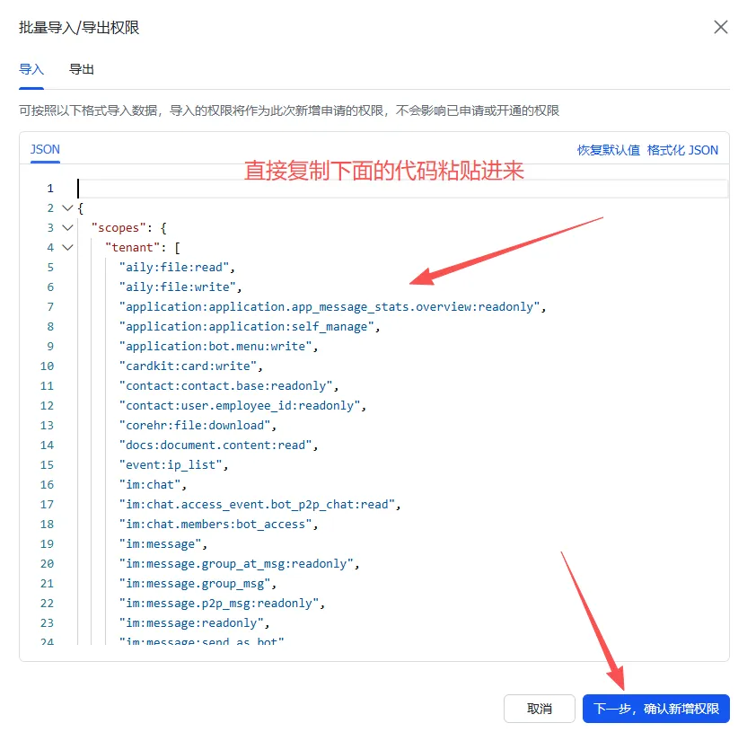 在权限管理页面,点击批量导入按钮,粘贴以下 JSON 配置一键导入所需权限: