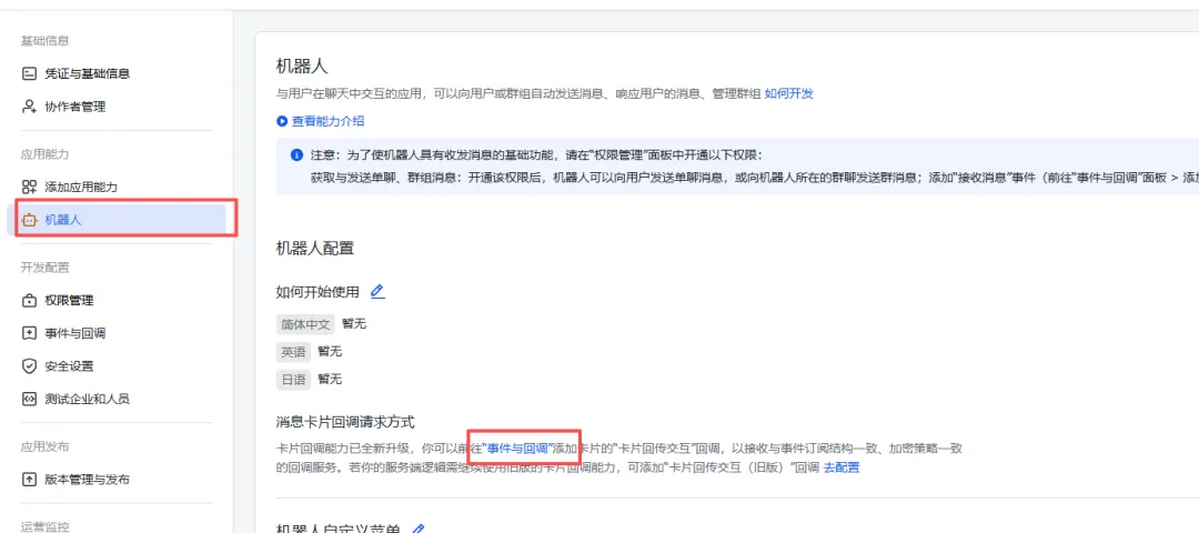 在应用能力==>机器人页面:开启机器人能力,配置机器人名称