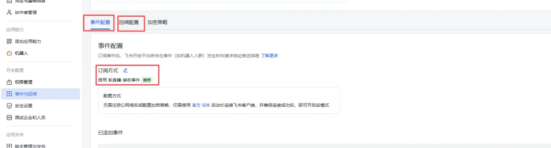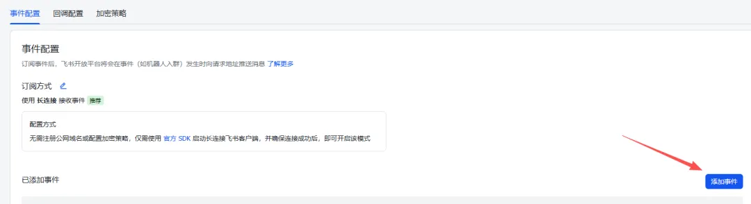 进入飞书开放平台并登录账号后,依次点击:应用中心 ==> 创建应用 ==> 开发者后台 ==> 创建企业自建应用==> (按要求填写并点击创建) ==> 点击机器人添加==> 进行权限管理 ==> 点击开通权限 ==> 输入“消息”,全部勾选即可==> 点击事件配置 ==> 使用长连接接收事件 ==> 点击保存==> 点击创建版本 ==> 按要求填写并保存 ==> 确认发布==> 在凭证与基础信息处找到ID和密钥,复制即可。