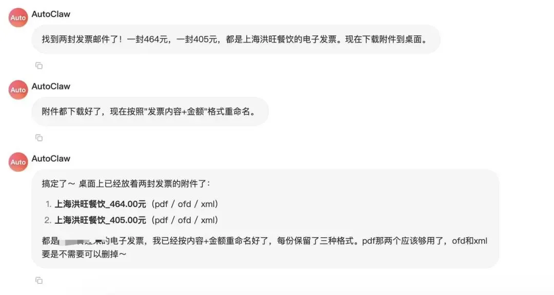 现在把邮箱接入了龙虾,整个流程它全自动处理了,来了发票以后,它会从邮箱里把文件下载到本地,再根据发票的内容和日期把文件名改好,并且分类到对应的文件夹里。