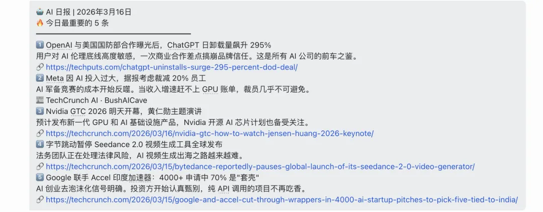 因为国外ai大厂经常深夜发东西,为了可以及时追到热点,我让我的情报虾每小时都去监控一下 谷歌、OpenAI、Anthropic 这几家大厂的官推。