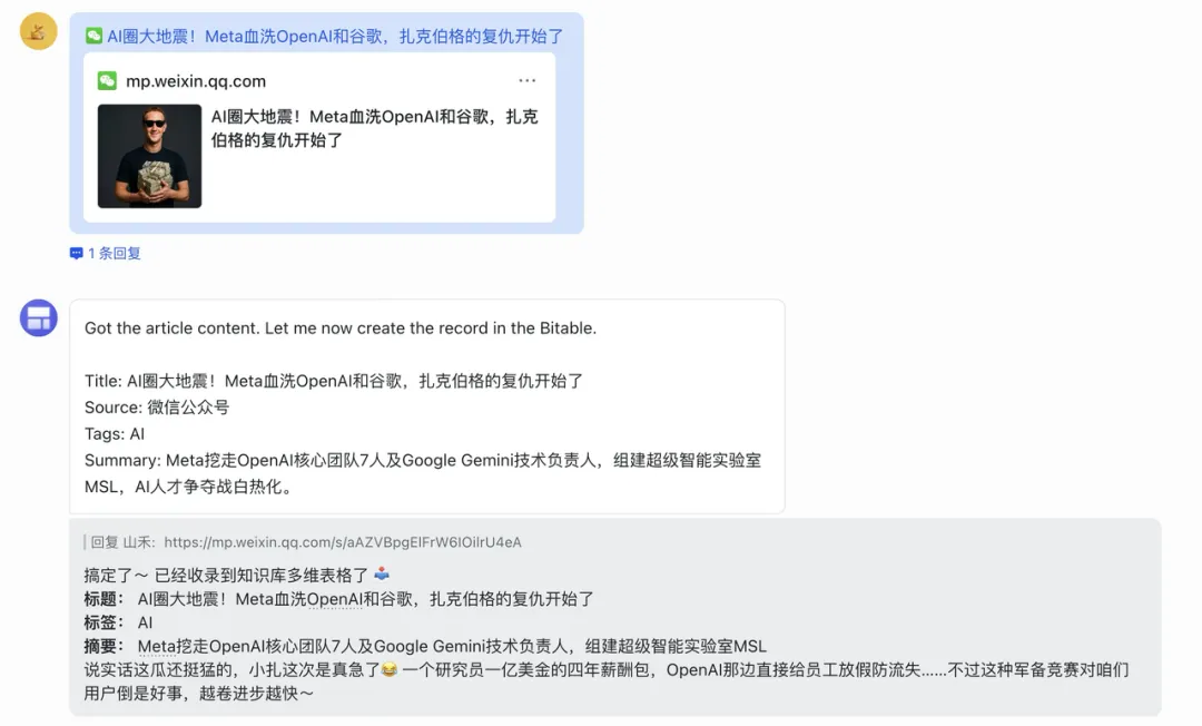 现在刷到好内容,会直接把链接发给龙虾,不管是文章、视频还是语音播客,它会自动提取内容、打好标签,存到知识库里。