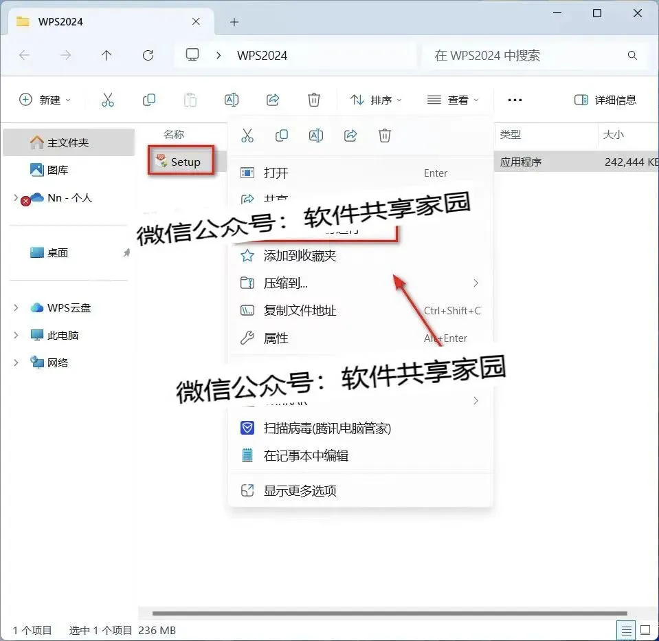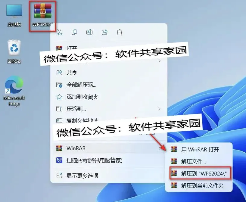 1.鼠标右键【WPS2024】压缩包,选择【解压到WPS2024】。