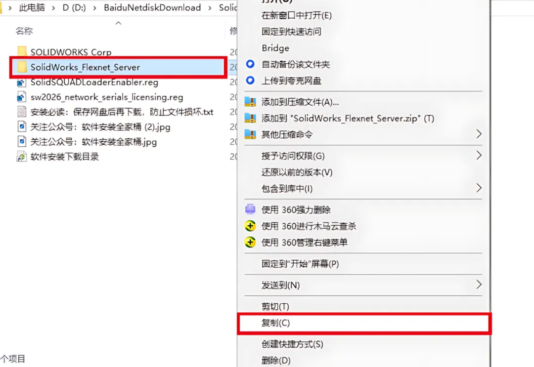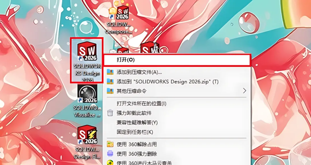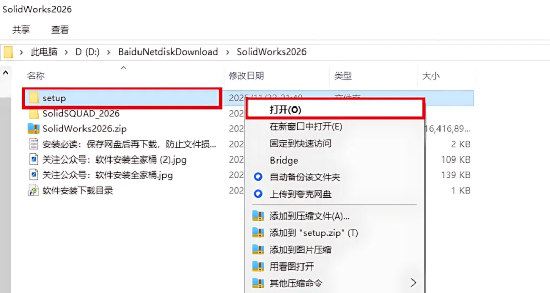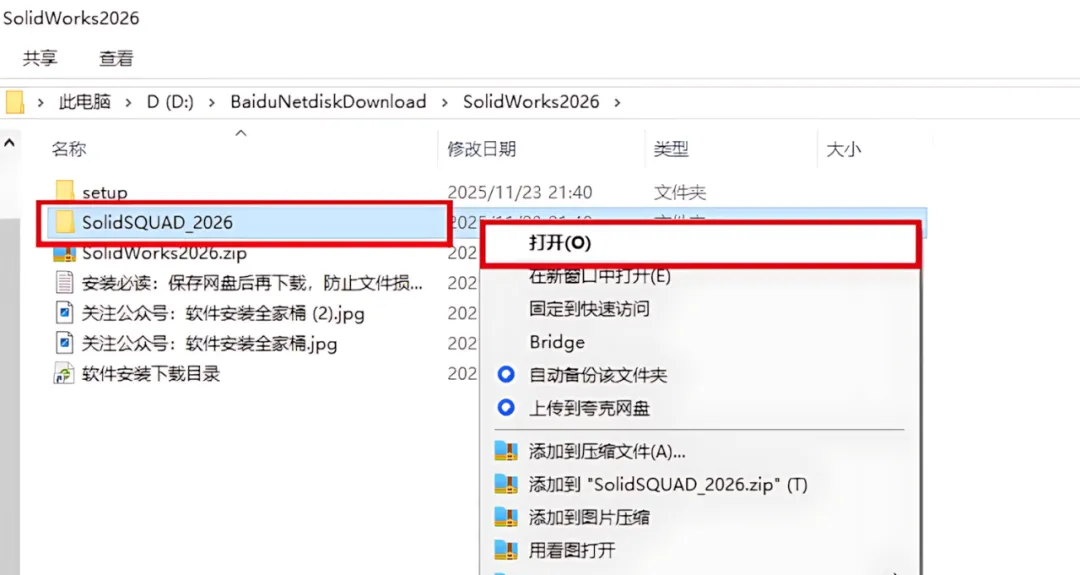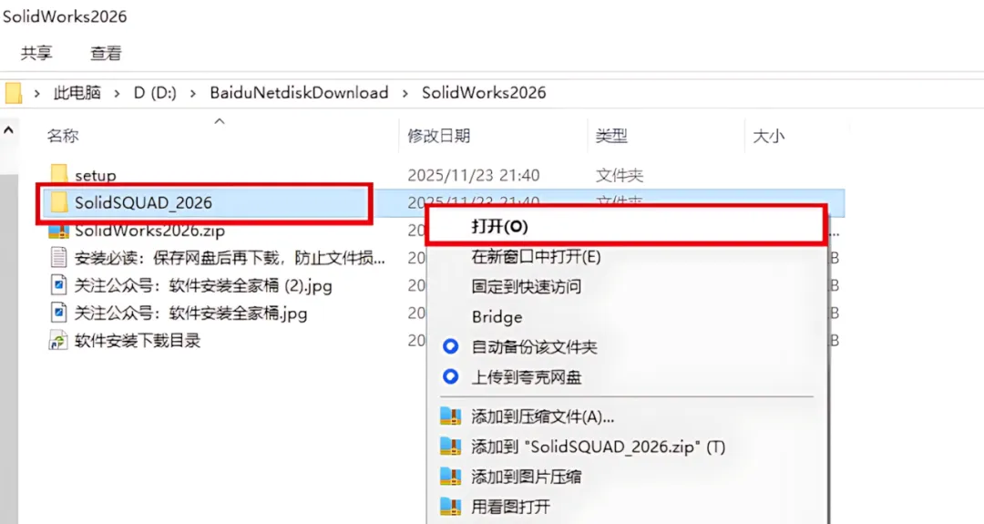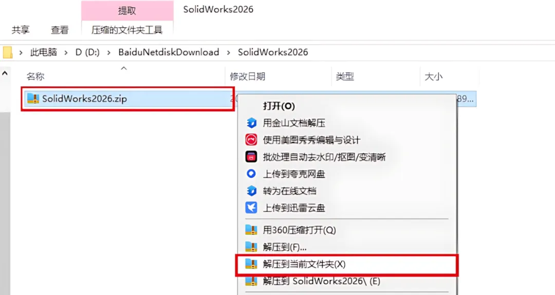 1、打开下载的SolidWorks 2026软件安装包,鼠标右击压缩包选择【解压到当前文件夹】。