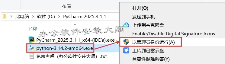 2.选中【python-3.14.2-amd64.exe】程序,右键点击【以管理员身份运行】。