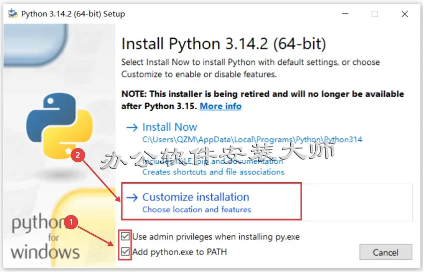 3.勾选 【Use admin privileges...】 和 【Add python...】 再点击 【Customize installation】 。