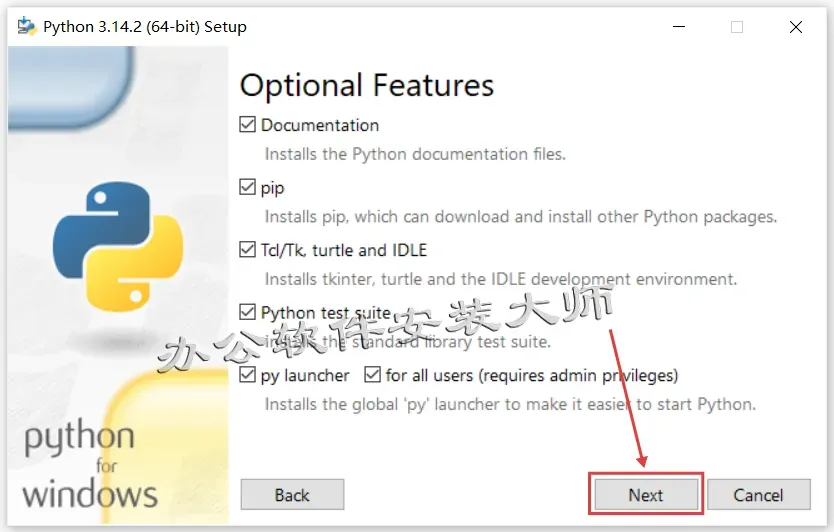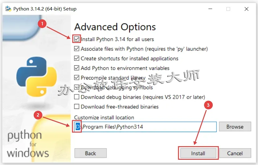 5.先勾选【Install Python 3.14 for all users】,然后更改安装位置:把地址栏首字母C改成D就可安装到电脑D盘 (可以自定义选择,最好跟着教程) 选择好点击【Install】。