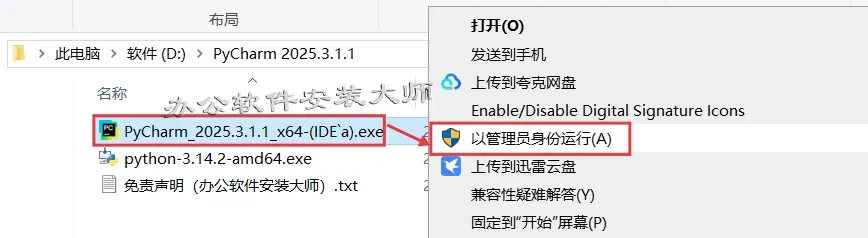 8.再回到安装文件夹,选中【PyCharm_2025.3.1.1_x64】程序,鼠标右键点击【以管理员身份运行】。