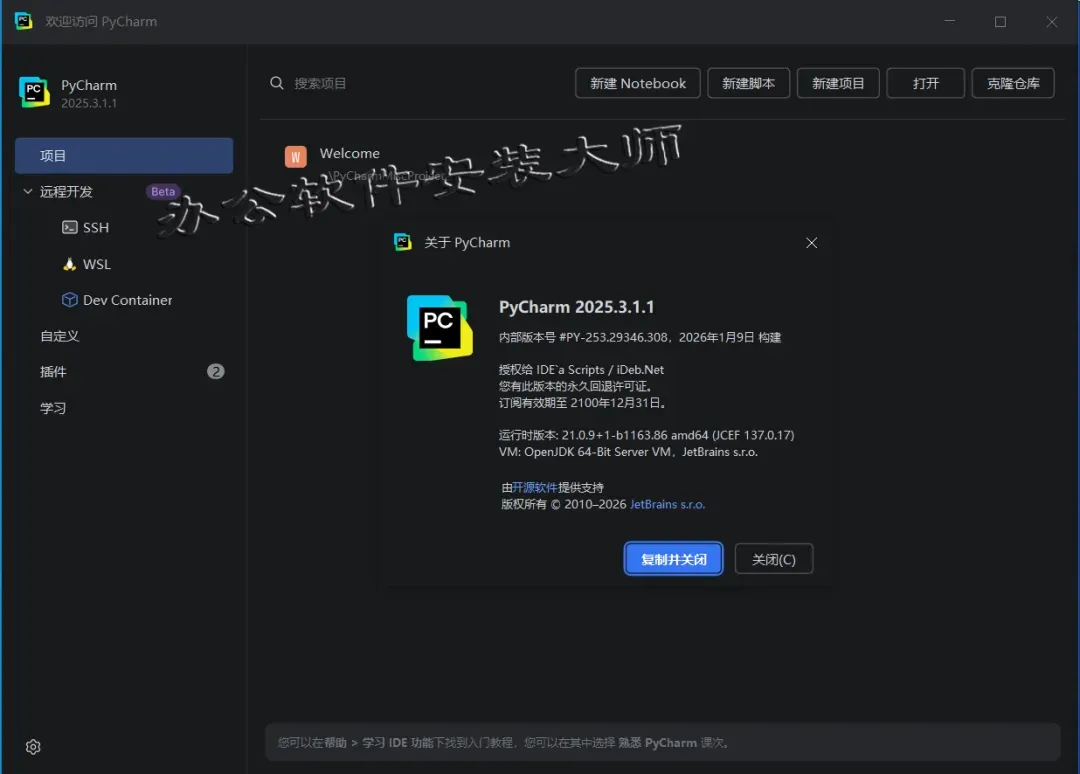 20.到此 PyCharm2025程序就 安装完成了,免激活工具打开就是激活状态,可创建项目正常使用!