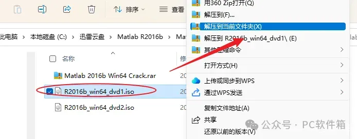3.选中【R2016b_win64_dvd1.iso】鼠标右键选择解压,解压完成之后,再把【R2016b_win64_dvd2.iso】解压到【R2016b_win64_dvd1.iso 】解压的路径里,出现替换时,点【替换】。