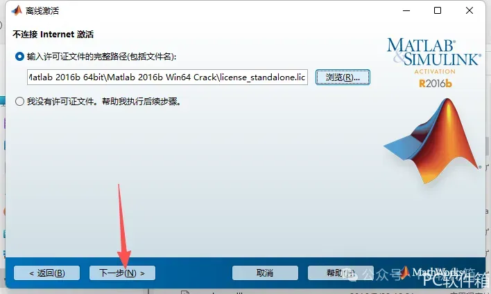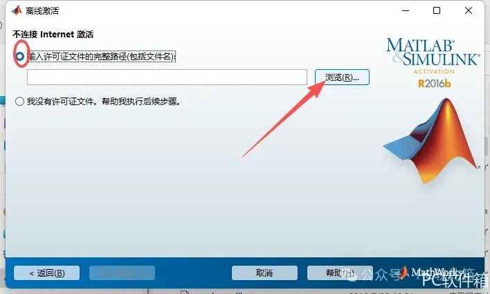 17.选择【输入许可证文件的完成路径】,然后点击【浏览】,选择刚才解压的【 Crack】 文件夹中的许可文件,(12步中提到过)。然后点击【选择】。