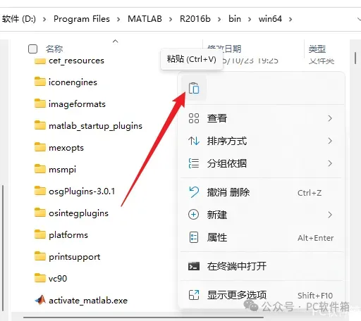 21.之后打开安装目录,我这里是【D:\ProgramFiles\MATLAB\R2016b\bin\win64】,在空白处鼠标右击选择【粘贴】。