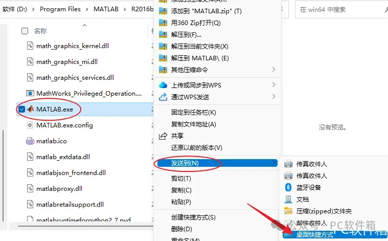 23.之后打开安装目录我这里是D:\ProgramFiles\MATLAB\R2016b\bin文件夹下的【MATLAB】启动图标,鼠标右键选择【发送到】-【桌面快捷方式】。