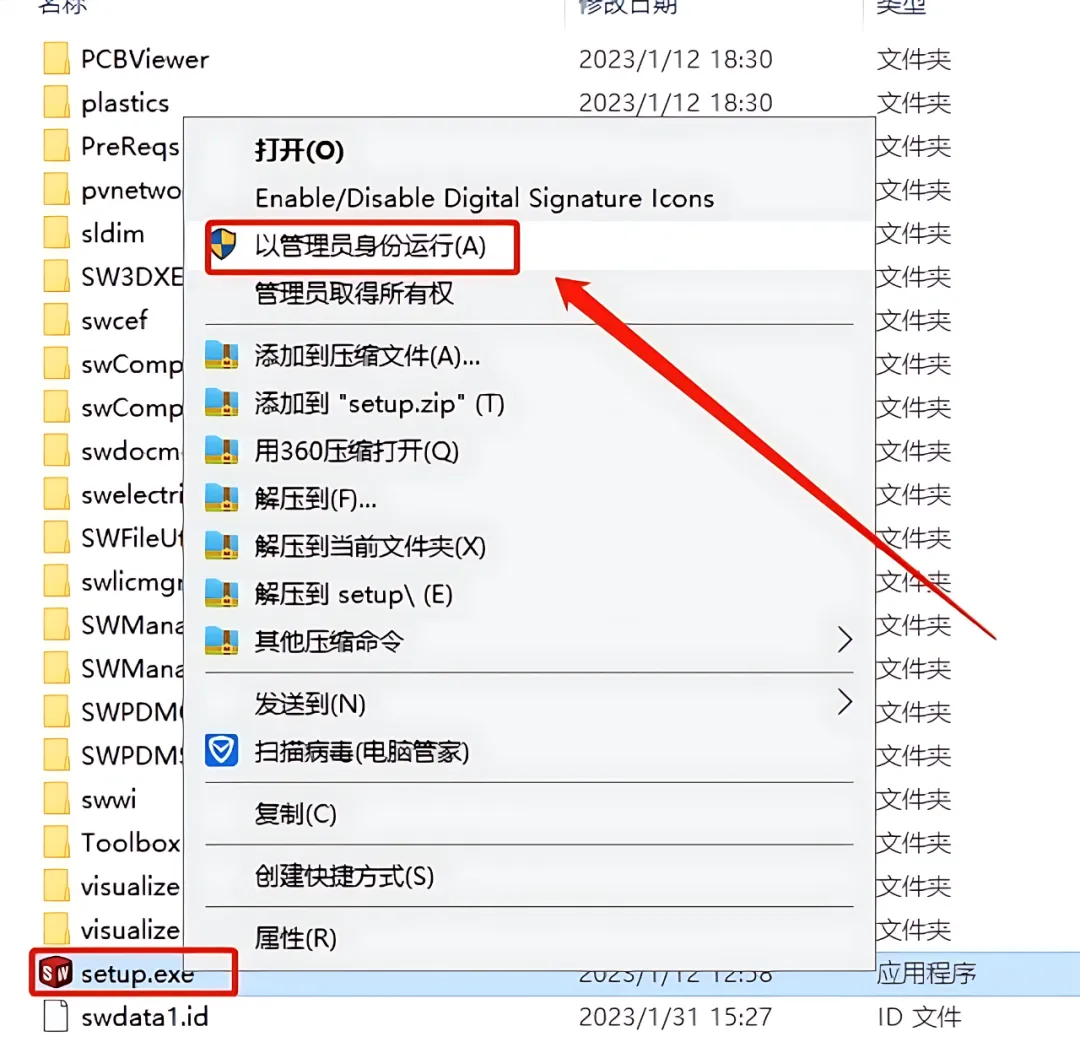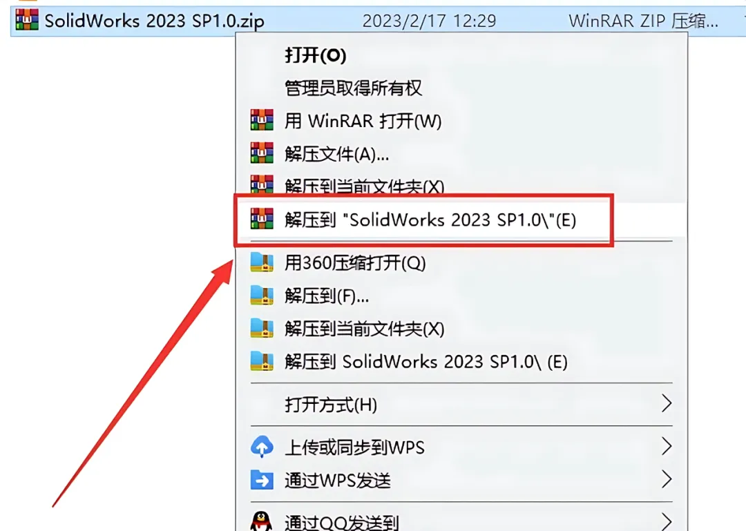 1.打开下载的SolidWorks 2023软件安装包,鼠标右击压缩包选择【解压到SolidWorks 2023】。