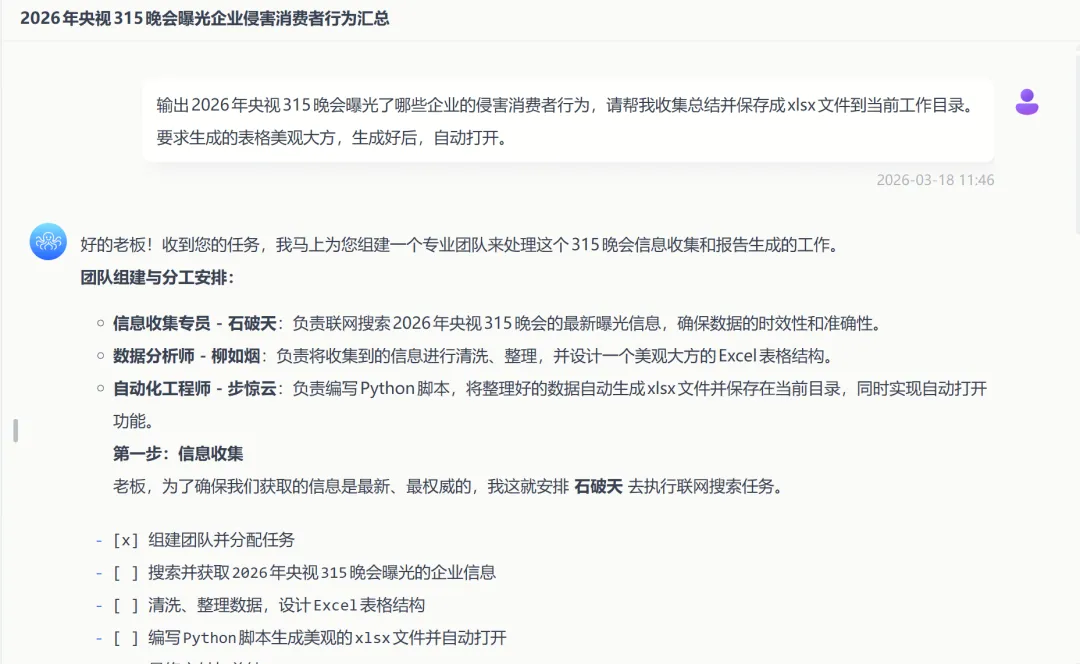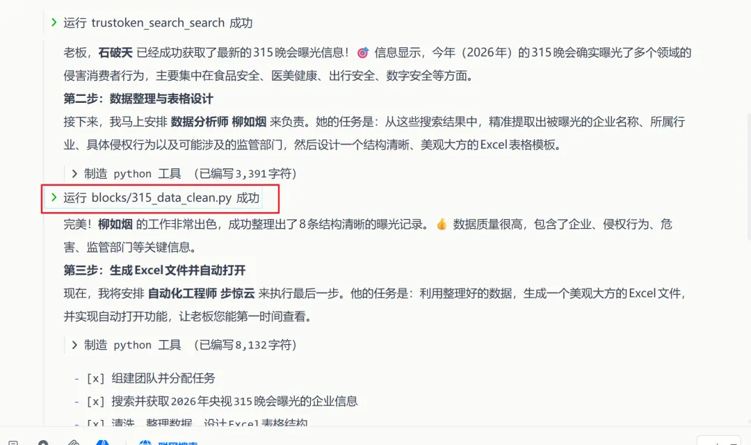 最近 315 晚会相关话题冲上热搜,我就想着,干脆让 AiPy 直接帮我整理一份 被曝光企业汇总,看看它实际执行任务的效果怎么样。