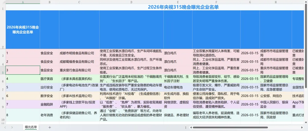像热度很高的 漂白鸡爪、GEO 等案例,都被整理进了表格里。而且信息维度也比较完整,不只是简单列一个名字,而是把 涉事主体公司、曝光原因、整改方向、整改执行部门 等内容都一并汇总好了,整体可读性和实用性都不错。