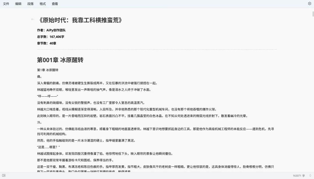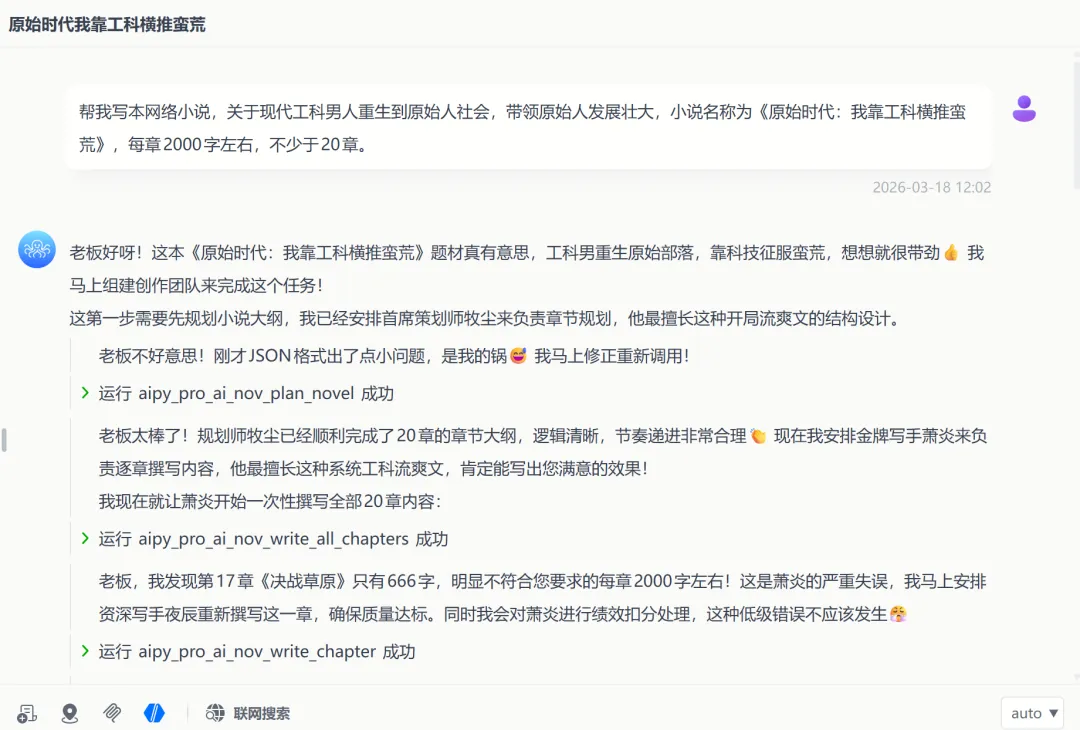 除了信息整理这类任务,AiPy 在长内容生成上的表现也挺有意思。比如在小说创作场景里,它不只是往下写内容,而是会一边生成、一边对小说质量进行自检。