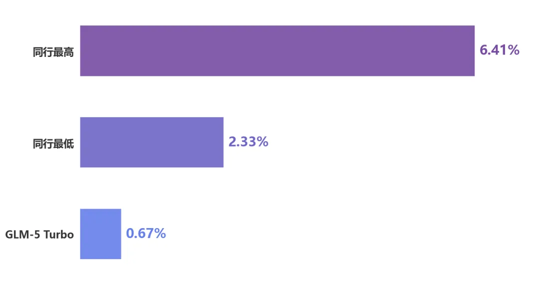 数据也印证了这个判断。在工具调用精确度上,GLM-5 Turbo 的错误率被压缩到了 0.67%。相比之下,第一梯队的其他通用模型,错误率普遍在 2.33% 到 6.41% 之间。
