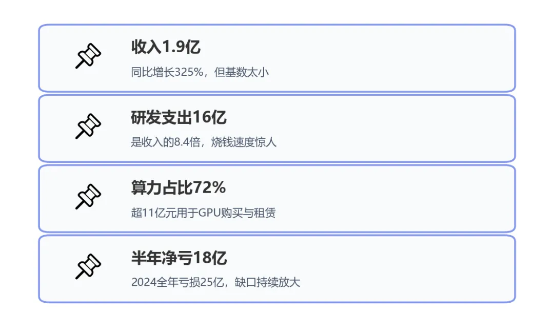 2025 年上半年,智谱收入 1.9 亿元,同比增长 325%。但研发支出狂飙至 16 亿元,其中 72% 用于购买和租赁 GPU 算力。收入 1 元,烧 8 元,6 元拿去交电费和显卡钱。结果是半年净亏 18 亿元。