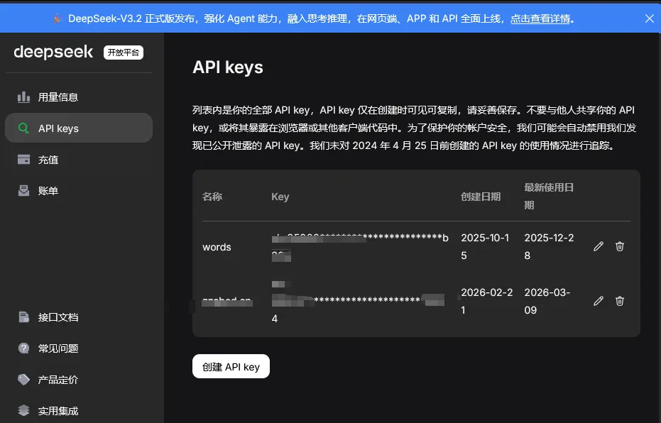 1. 打开浏览器,访问 platform.deepseek.com[1] 2. 点击右上角“注册”,用手机号注册账号 3. 登录后,点击左侧菜单的“API Keys” 4. 点击“创建API Key”,随便起个名字(比如“myclaw”) 5. 复制保存好这串密钥(它只会显示一次!)