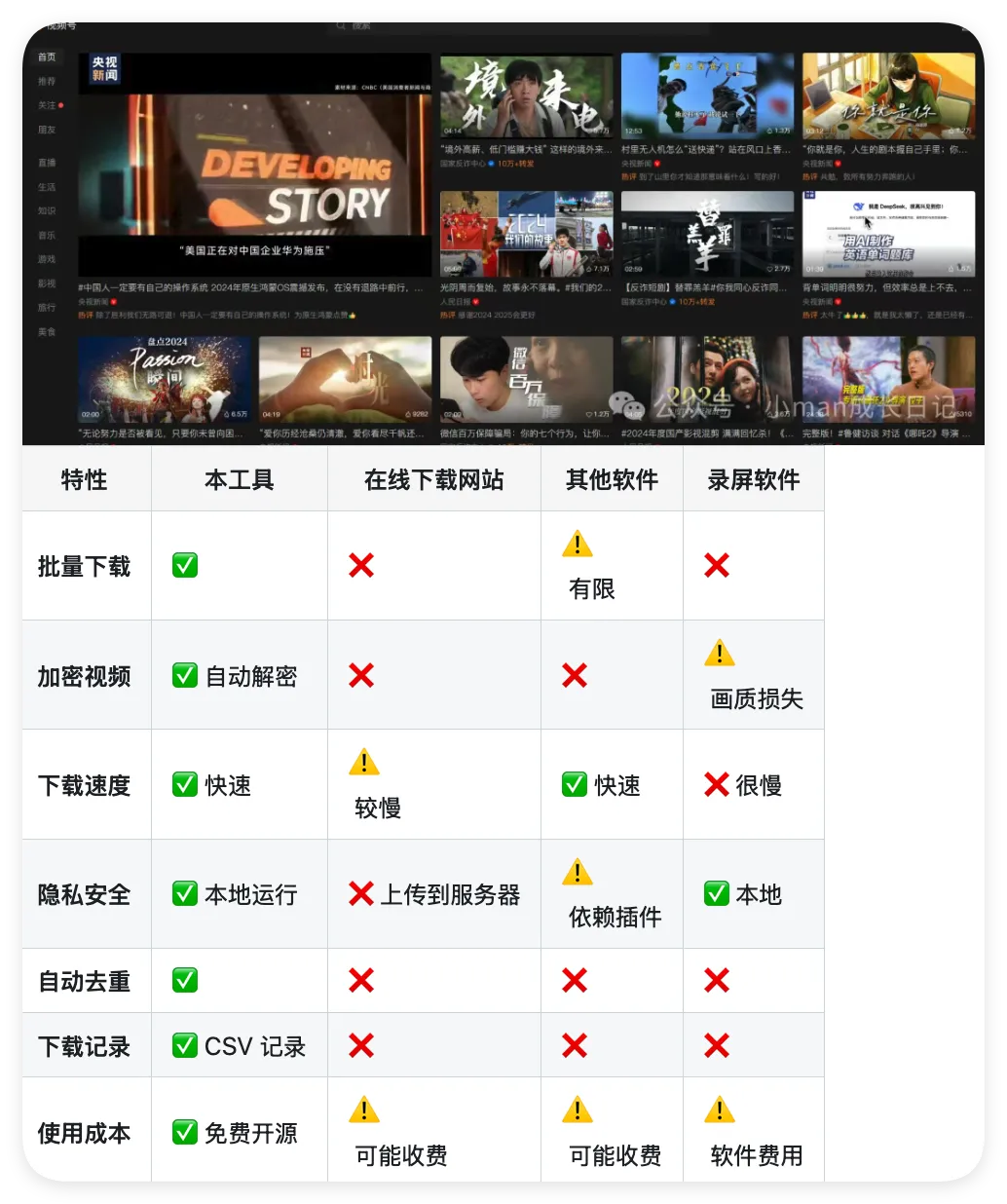 支持批量下载视频号内容,提供自动解密、自动去重及获取下载链接等功能,并可生成 CSV 记录。该工具适用于 Windows 平台,属于开源项目,使用时需具备管理员运行权限并安装相关证书。