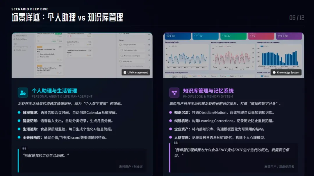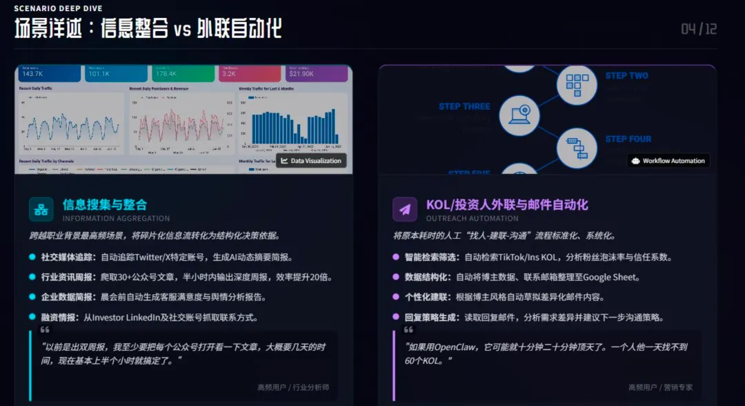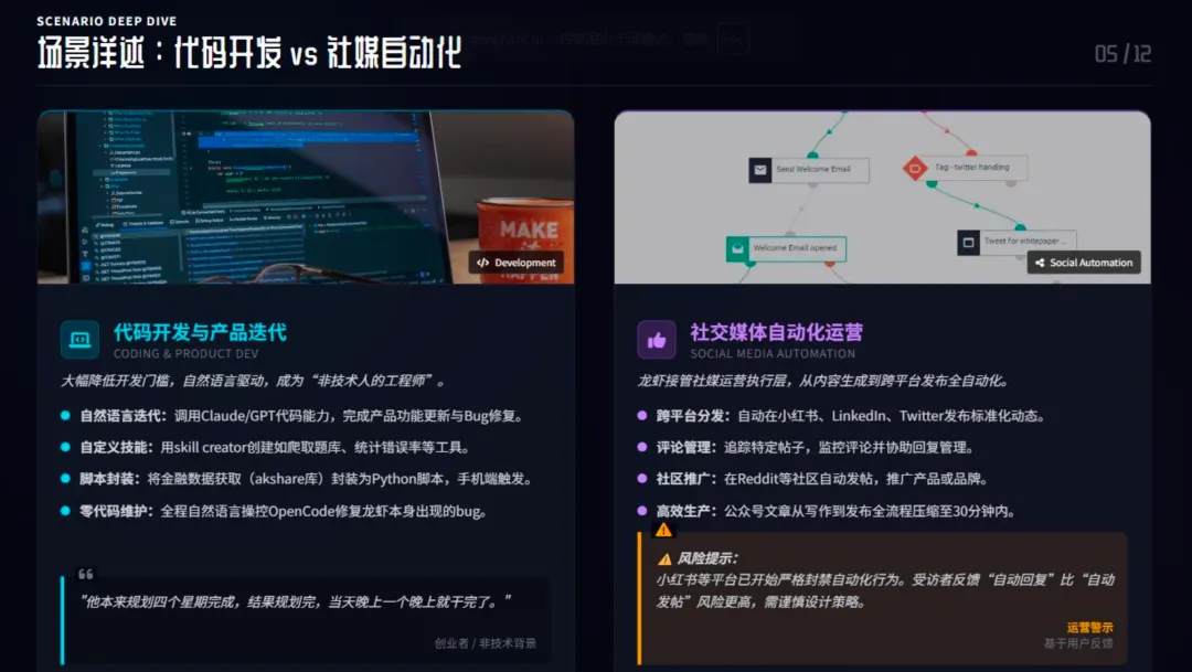 从这些高频用法里,能清晰看到龙虾的定位,也能看懂未来人机协作的正确方式。龙虾在工作和生活里承担着四个核心角色:超级执行者、非技术人的工程师、个人秘书、数字分身雏形。它的核心价值,是把人类已经定义好的执行类工作系统化,而不是替代人类做判断。健康的人机协作,遵循几个简单的原则:人类负责定义规则、把控决策,龙虾负责重复性的执行工作;它是人的效率放大器,解放 80% 的重复劳动,让人聚焦战略、关系维护等高价值事情;全程用自然语言交互,降低操作门槛;2-3 人的核心团队搭配多个 AI 智能体,就能低成本搭建虚拟部门,实现规模化产出。同时信任要有边界,涉及隐私、资金、重大决策的环节,必须保留人工复核。落地使用也不用搞复杂,先把模糊需求拆解成标准 SOP,让 AI 能准确执行;再建立监控告警机制,避免夜间任务中断;最后做好安全合规,只用可信的插件,严控敏感数据权限。