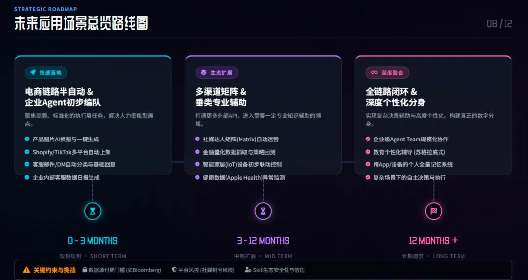 这份报告也给出了龙虾清晰的落地路线,对个人和中小企业来说,是实实在在的红利。短期 0-3 个月,聚焦电商半自动运营、企业 AI 智能体初步编队,搞定选品、上架、客服基础回复等标准化执行任务;中期 3-12 个月,实现全链路闭环,打造个性化数字分身,打通金融量化、智能家居、健康数据等场景;长期 12 个月以上,实现企业 AI 团队规模化协作,甚至做苏格拉底式的个性化教育辅导。当然它也有明确的痛点,比如长期记忆不稳定、第三方插件的安全信任问题、社媒平台风控严格、专业数据源需要高额付费。但这些问题,也是整个 AI 智能体行业接下来要解决的核心方向。对 10-50 人的中小企业来说,龙虾的价值尤其突出。用极低的成本,就能搭建 CMO、客服、运营类的 AI 数字员工团队,形成虚拟部门,不用养大团队,就能实现规模化的产出。我做云计算多年,始终觉得判断一个 AI 工具有没有价值,从来不看技术参数有多强,而是看它能不能融入真实工作流,解决实际问题。龙虾的这些高频场景,没有炫技,全是落地。它证明了 AI 的终极价值,从来不是飘在天上的概念,而是沉到地上的执行。未来,会有更多这样的 AI 智能体走进工作和生活,我们不用抗拒,也不用盲从,学会用好这些数字助手,把时间留给思考、创造和有温度的事,才是人机协作的最终意义。