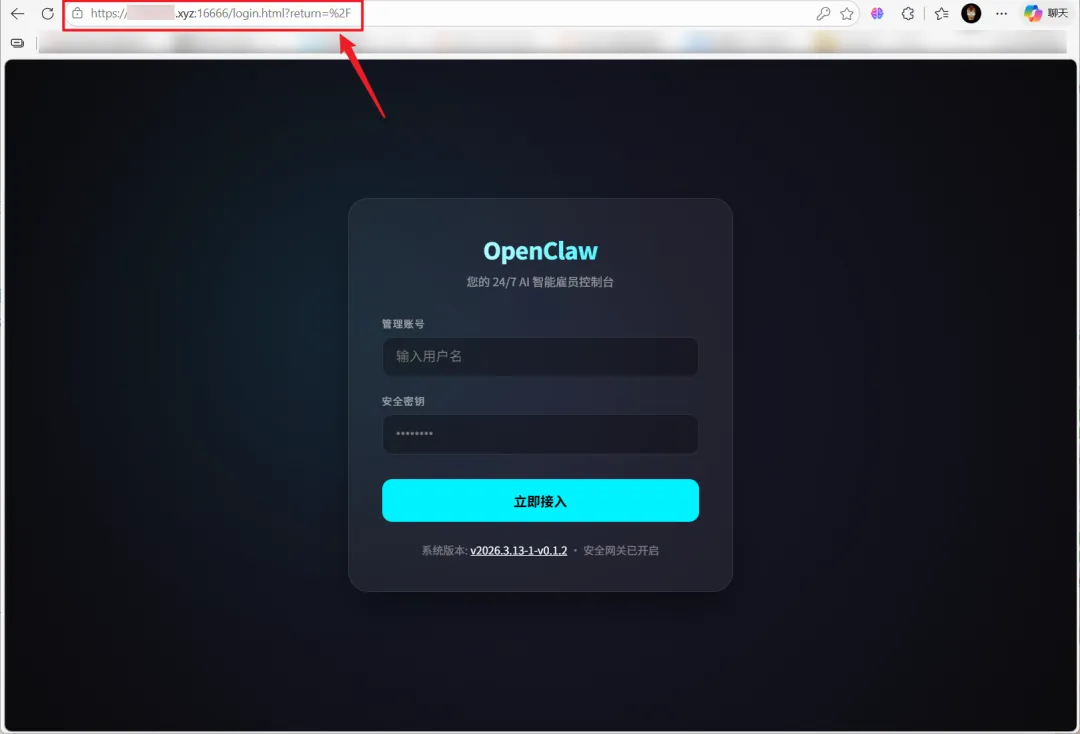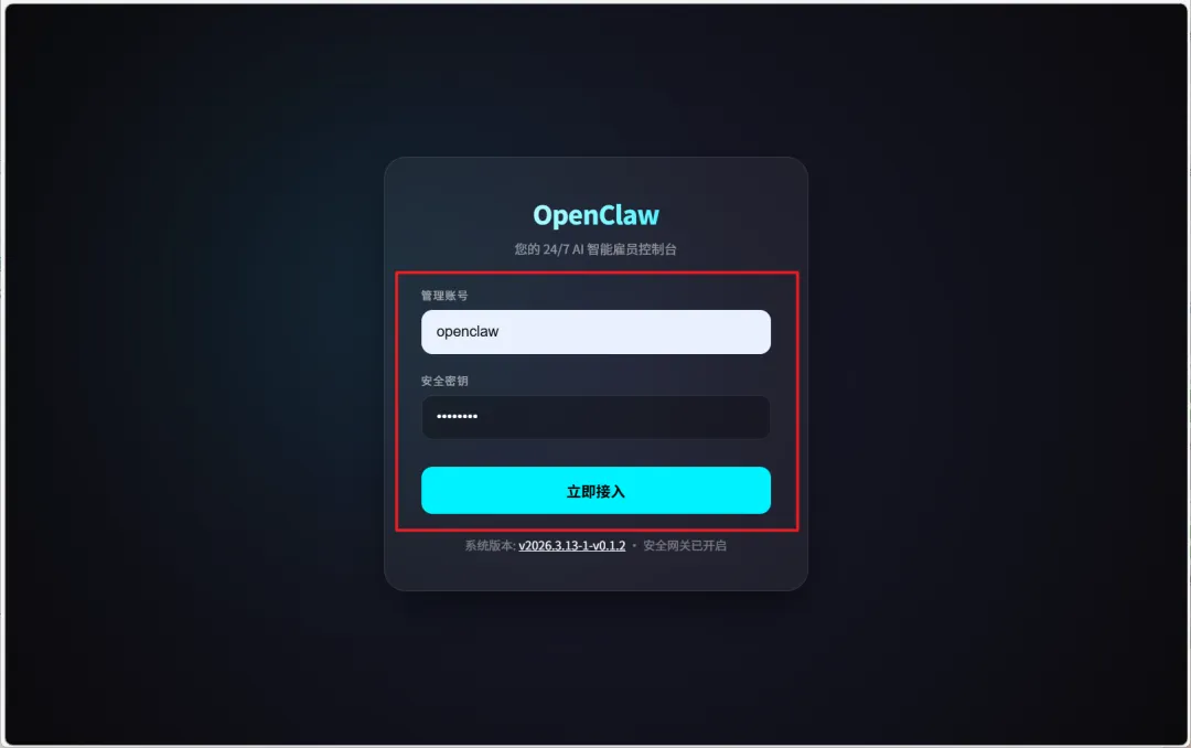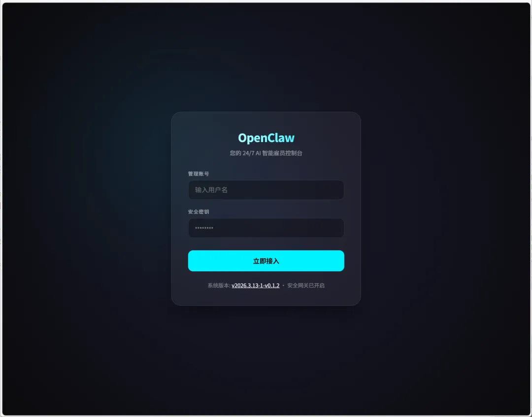 🔺首次打开项目会有一个基于OpenResty+Lua提供用户登录认证功能,默认的用户名和密码均为“openclaw”(如果在部署的时候你没有更改)。
