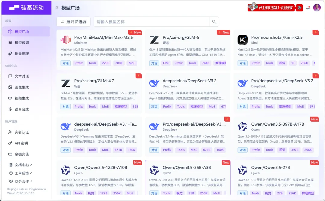 硅基流动的优势在于丰富的模型矩阵,包含语言、 图像、 视频、语音等各种类型,可选择性很多。目前硅基流动对于新人也有不错的福利,每位新用户注册后都能直接领取 16 元的全站通用券,可以用来调用任意模型,等于白嫖一波体验。你可以去官网注册,也可以通过我的邀请链接注册,内容完全一样,只是顺手支持一下我