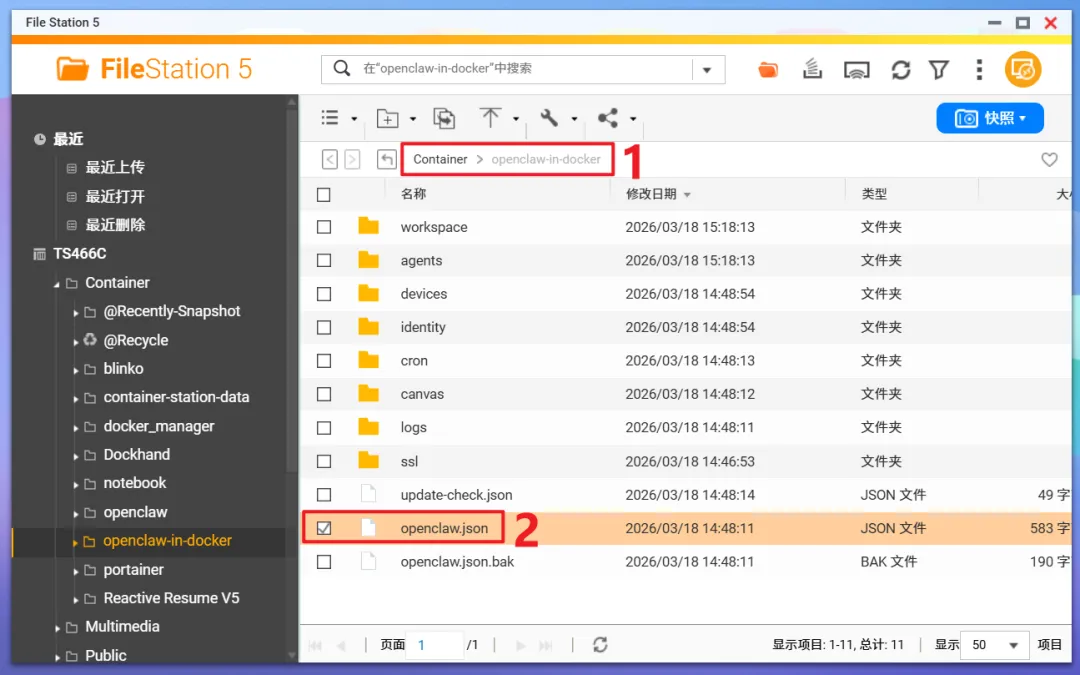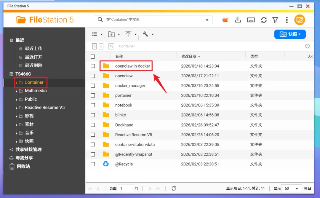 🔺先在Docker目录下(威联通默认的Docker目录为“Container")新建一个“openclaw-in-docker”文件夹。