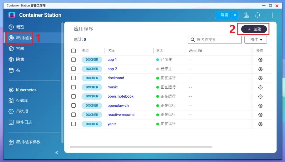 🔺然后打开威联通Container Station,选择“应用程序--创建”。