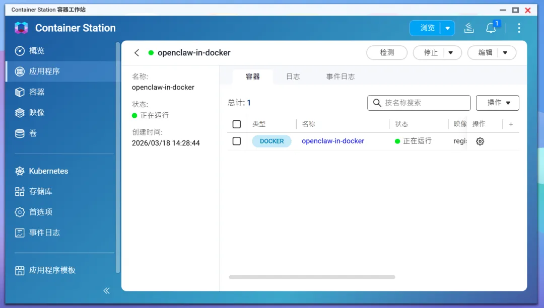 🔺镜像比较大,耐心等待即可。最后如果没什么问题,就能看到容器显示“正在运行”中。
