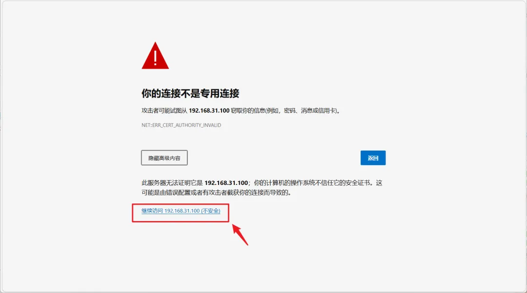 🔺其实这个时候我们直接使用【https://IP:端口号】的方式也可以直接打开项目,但是因为证书不是自己的,所以会有一个安全警告。