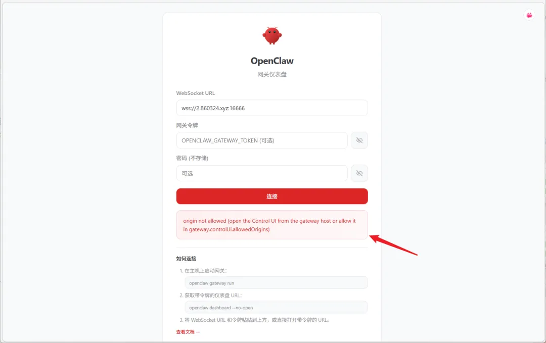 🔺进来之后会有一个“origin not allowed”的报错,这是因为运行的端口和浏览器的端口不一致导致的。按作者说的我们部署的只要指定OpenClaw 的 Web 地址,它会自动写入到配置中,但是很明显是没有的,所以我们需要手动写入配置。(不排除在你们看到这篇文章的时候作者已经修复了这个BUG)。