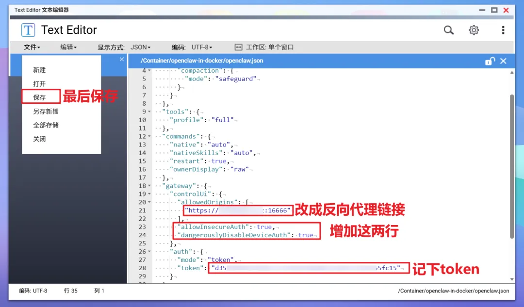 1,将“gateway--allowedOrigins”下面的链接改成反向代理的链接 2,在图示位置增加【 "allowInsecureAuth": true, "dangerouslyDisableDeviceAuth": true】这两行,请注意这两行的格式和缩进。最简单的办法就是扔给AI优化下,然后再粘贴过来。
