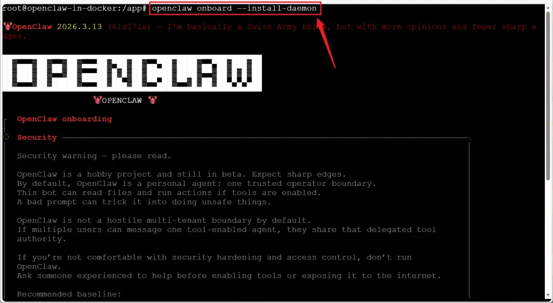 🔺至于初始化配置上,其实和上篇文章一模一样。同样在执行终端的页面,输入命令“openclaw onboard --install-daemon”启动初始化向导。