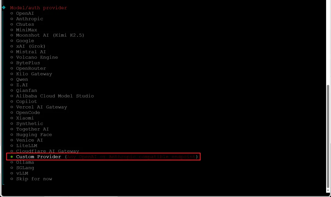 🔺初始化向导的操作基本没啥可说的,直接抄作业就可以。唯一的区别在模型的选择这步,如果是硅基流动,这里需要选择“Custom Provider”。