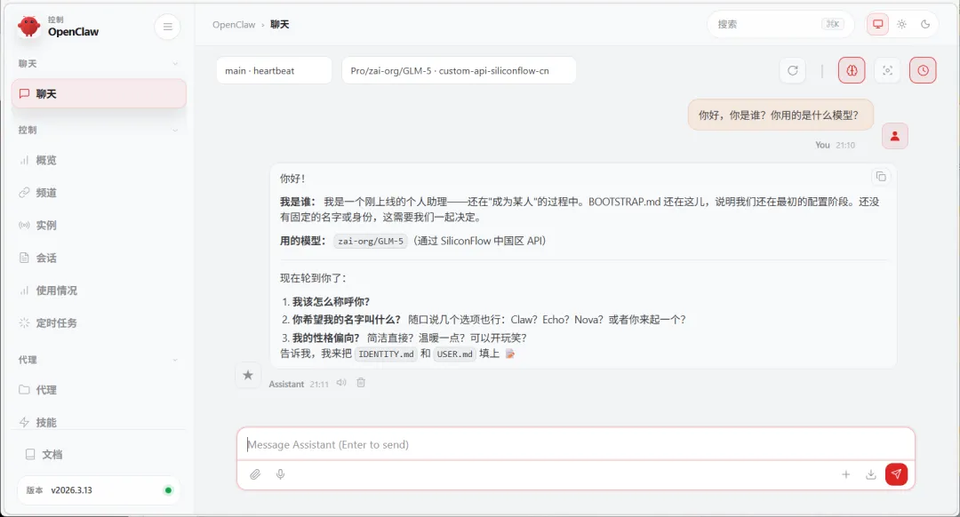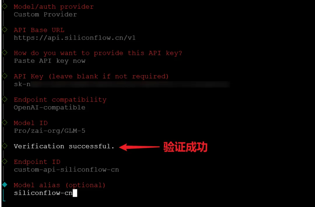 API Base URL:https://api.siliconflow.cn/v1 API Key:你自己真实的 API Key Model ID:大模型 id,直接在硅基流动那边随便复制一个就可以了,后期可以让龙虾自己更换 Model alias:模型别名,其实就是便于你自己区分的,随便填就可以。