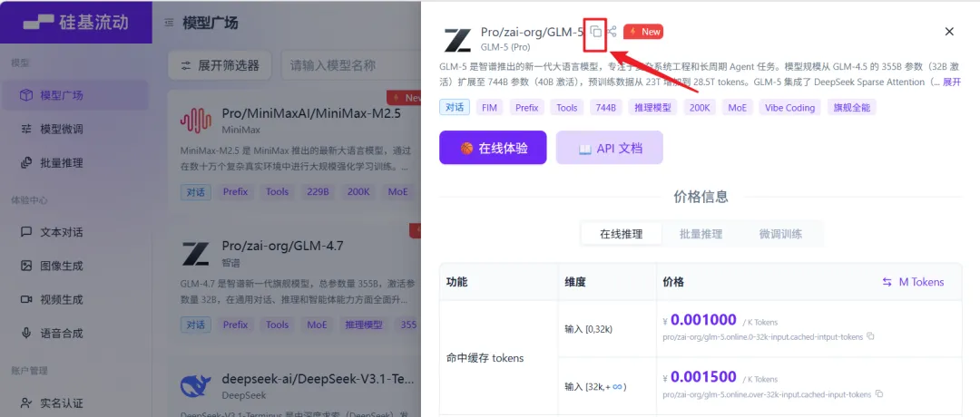 🔺大模型 id直接打开硅基流动的模型广场,选中一个模型打开详情,它后面自带复制按钮。