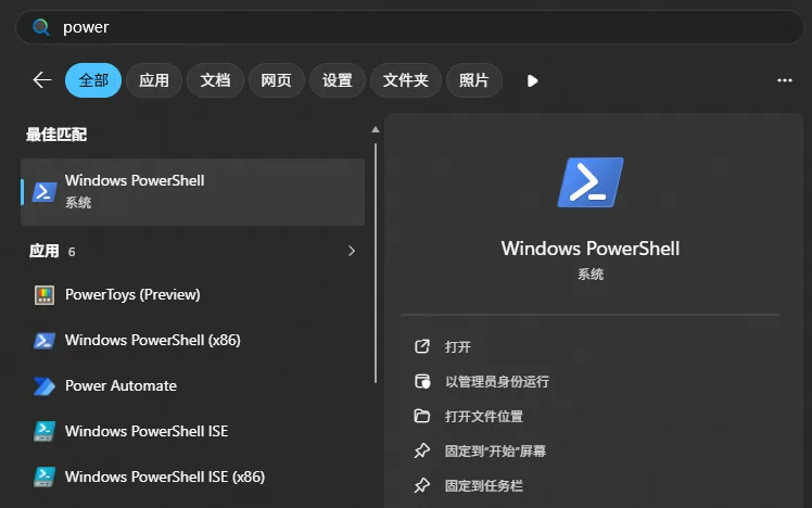 点击 Windows徽标,输入 powershell,即可找到该应用。