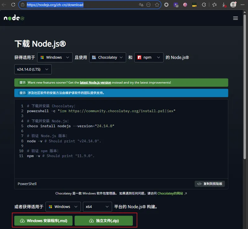 安装包地址https://nodejs.org/dist/v24.14.0/node-v24.14.0-x64.msi